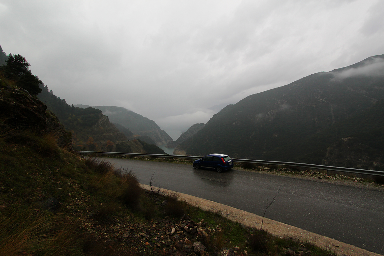 Περνάμε από το φράγμα της Ευηνόλιμνης, αλλά κανένα κλικ γιατί είμαστε μέσα στην ομίχλη του απόβροχου. Ανεβαίνουμε από Νεοχώρι, ανηφορίζουμε και η ορατότητα ξανάρχεται και προς την όμορφη Αράχοβα Αιτ/νίας, σε ένα α-πι-στευ-το σκηνικό.